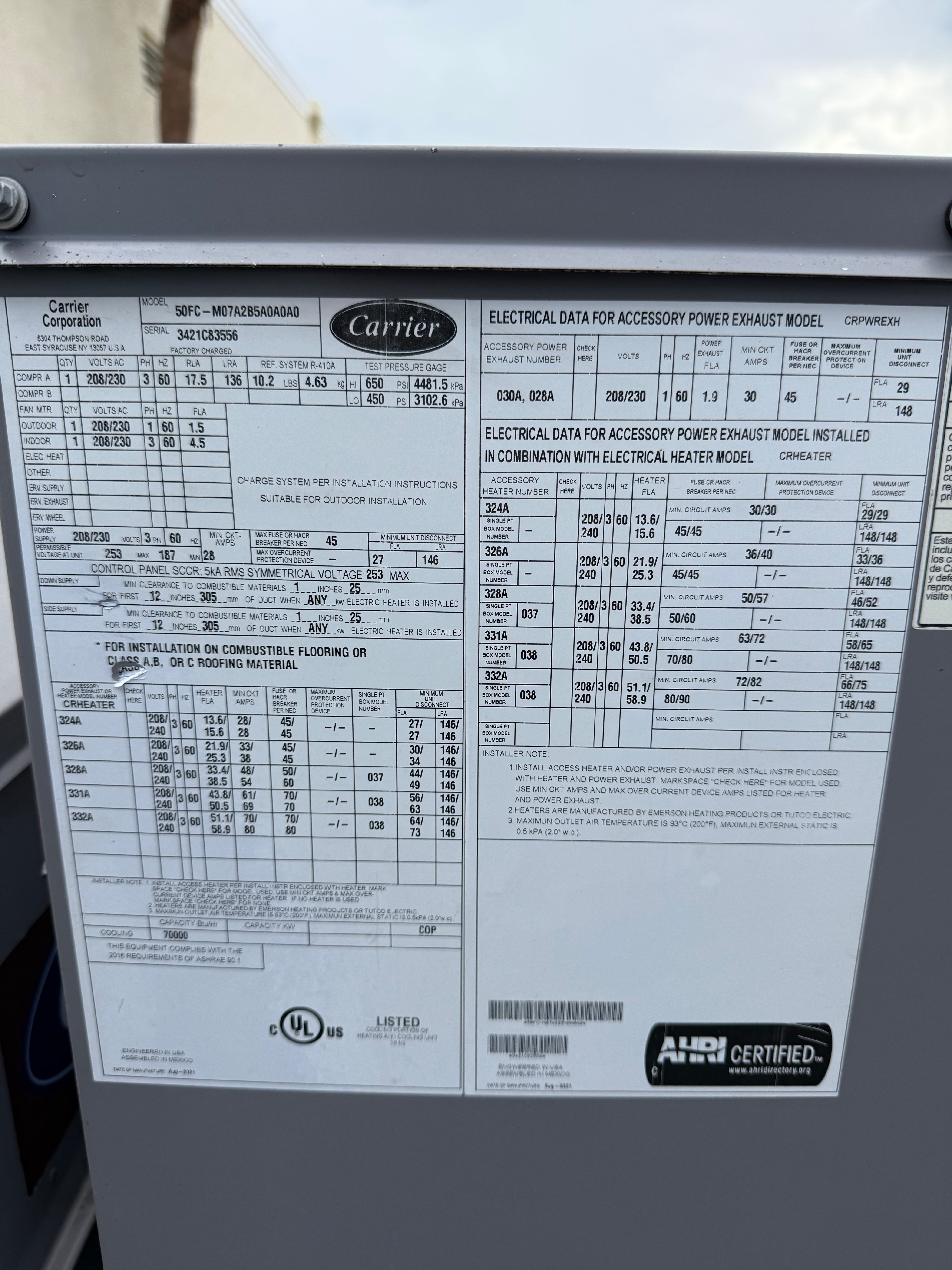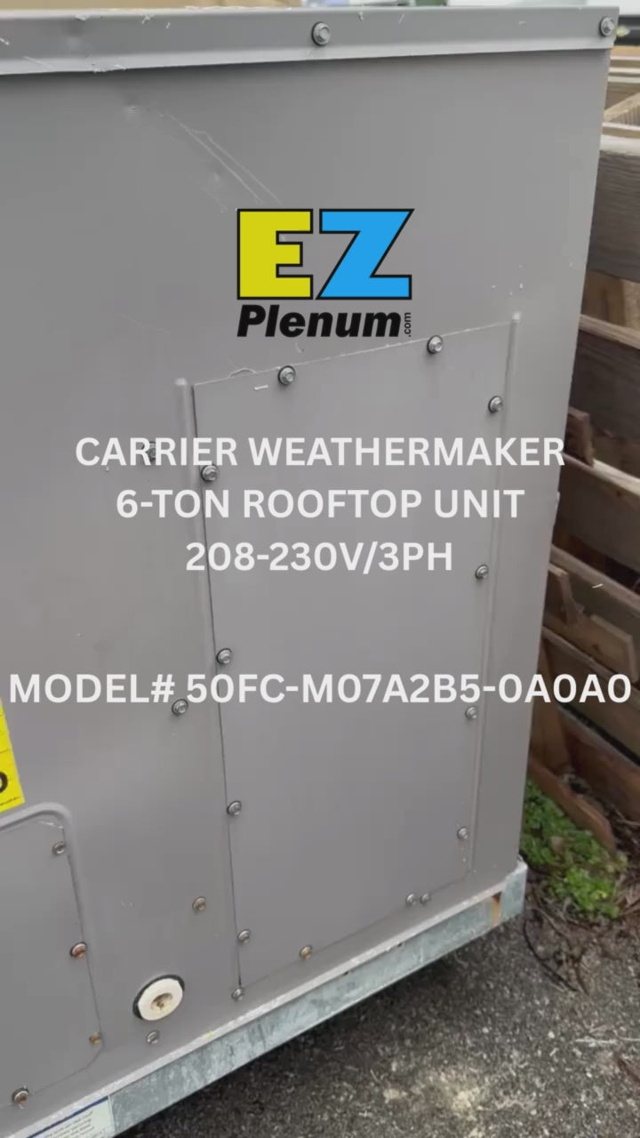 Up for sale is a used 50FC-M07A2B5-0A0A0 Carrier Weathermaker 6-ton, 208-230V/3PH, R410A cooling only packaged rooftop unit. It has an EcoBlue direct drive medium static blower motor with a factory precoated condenser coil.